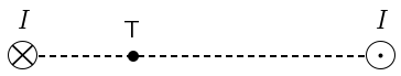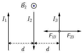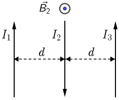 $I_1 = 2\,\text{A} $, $I_2 = I_3 = 3\, \text{A}$. Međusobna udaljenost $d$ pojedinih vodiča je 5 cm.