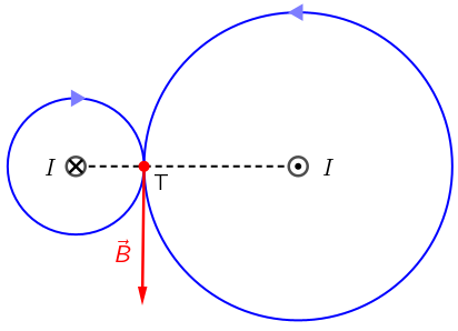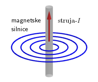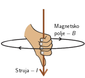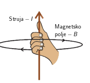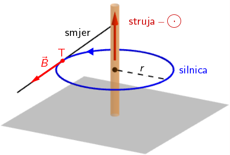 Magnetsko polje vodiča kojim prolazi struja $I_2$ na udaljenosti 5 cm od vodiča iznosi $B_2 = 6\, \text{μT}$.
