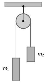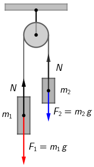 koja je prebačena preko nepomične koloture. Masa utega $m_1$ veća je od mase utega $m_2$.