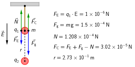 ovješeno na nit duljine $\ell$. Električno polje iznosa $40\, \text{N/C}$ usmjereno je vertikalno prema