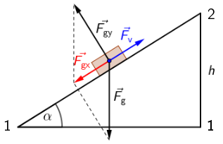 U slučaju A, pri jednolikom podizanju vertikalno prema gore, svladavamo silu težu: $$F_\text{A}=m\,g$$ U slučaju B tijelo vučemo prema vrhu kosine silom koja je jednaka komponenti sile teže u smjeru kosine: $$F_\text{v}=F_\text{gx}$$ $$F_\text{B}=m\,g\,\text{sin}\,\alpha$$